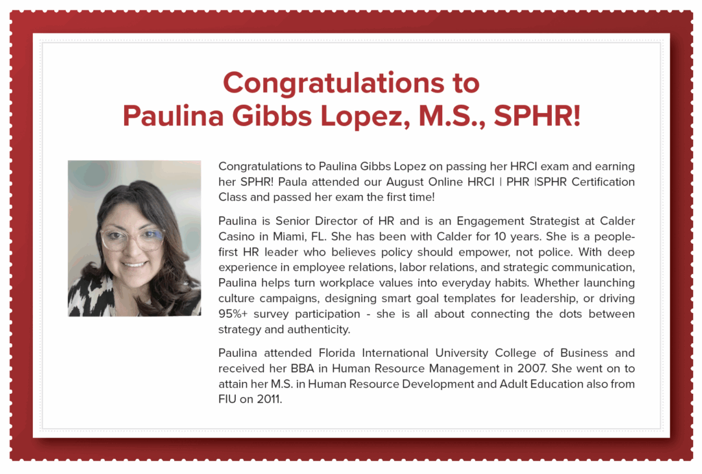Congratulations to Paula Gibbs Lopez, M.S., SPHR