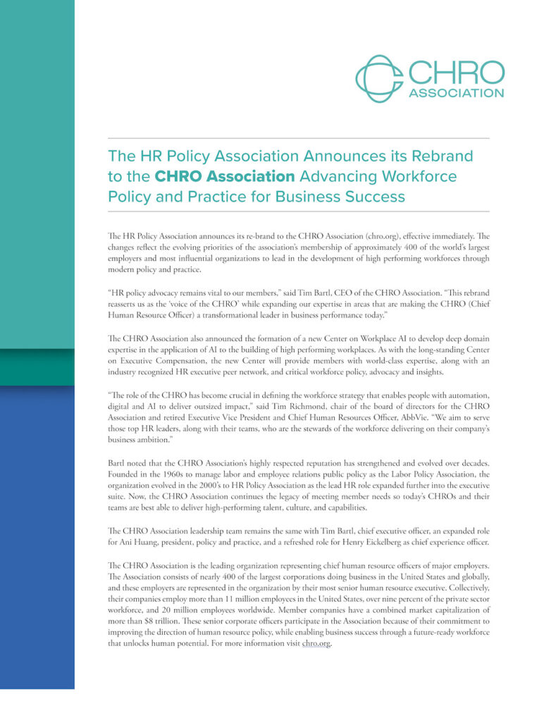 Talent Management The HR Policy Association Announces its Rebrand to the CHRO Association Advancing Workforce Policy and Practice for Business Success FacebookTwitterPinterestWhatsApp