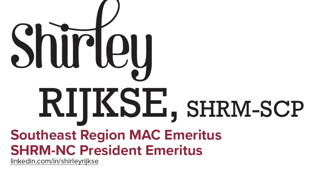 Profile: Shirley Rijkse, SHRM-SCP, DTM, Southeast Region MAC Emeritus, SHRM-NC President Emeritus FacebookTwitterPinterestWhatsApp